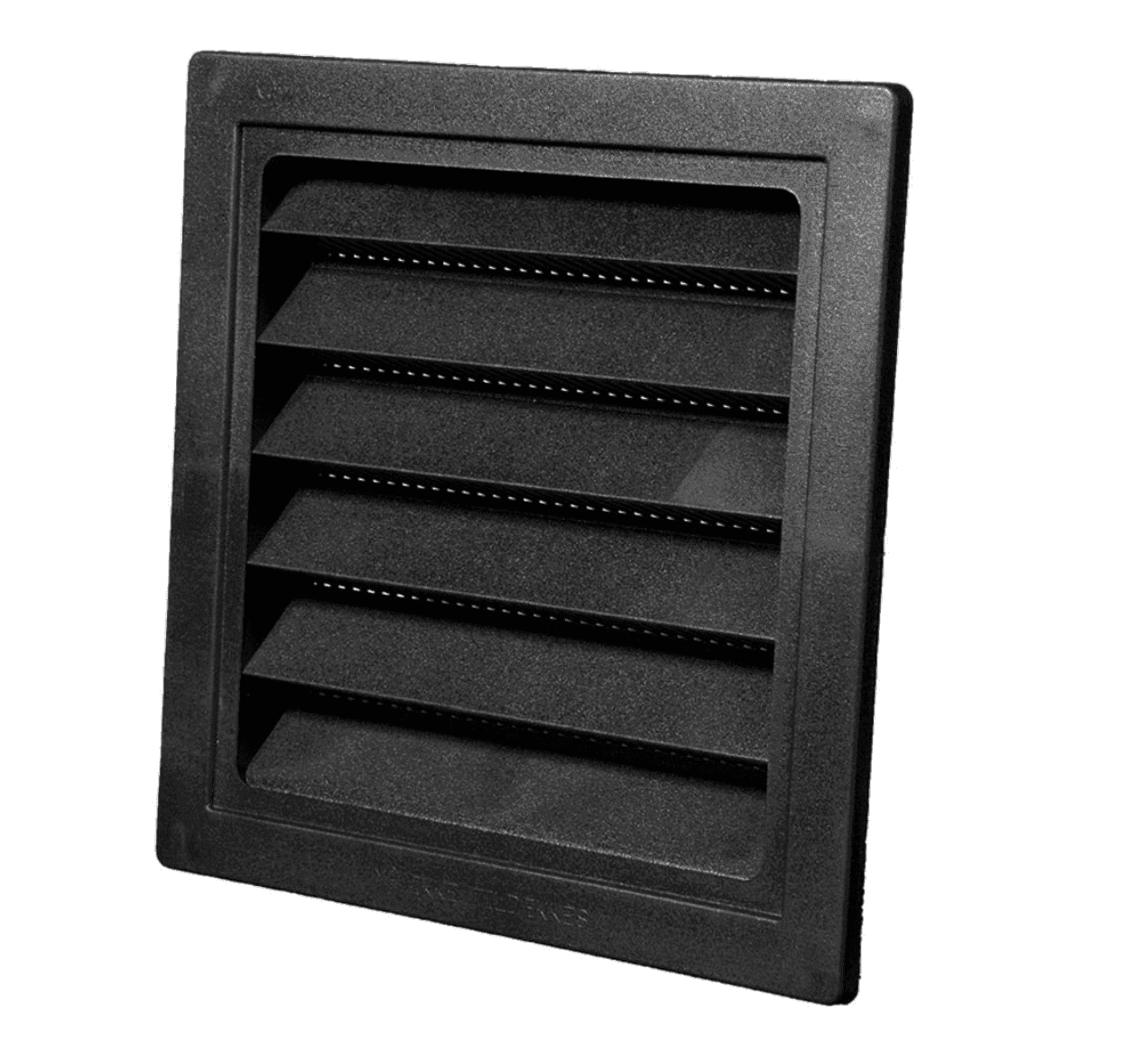 Louvre grille, 150x150 mm – Exist in color red, white, black and grey For external installation Has small ribs beneath the slanted louvres to keep out insects and other small animals Fits wall duct 111195 (see related products) Dimensions (A×B×C×D×E×F, see attached file): 177×140×177×140×27×22 mm Air passage: 57 cm²
